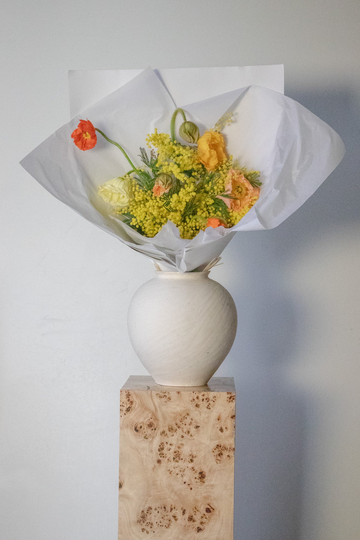 Our mimosa and Icelandic poppy arrangement comes gift wrapped in water and finished with our care guide and handwritten note card.