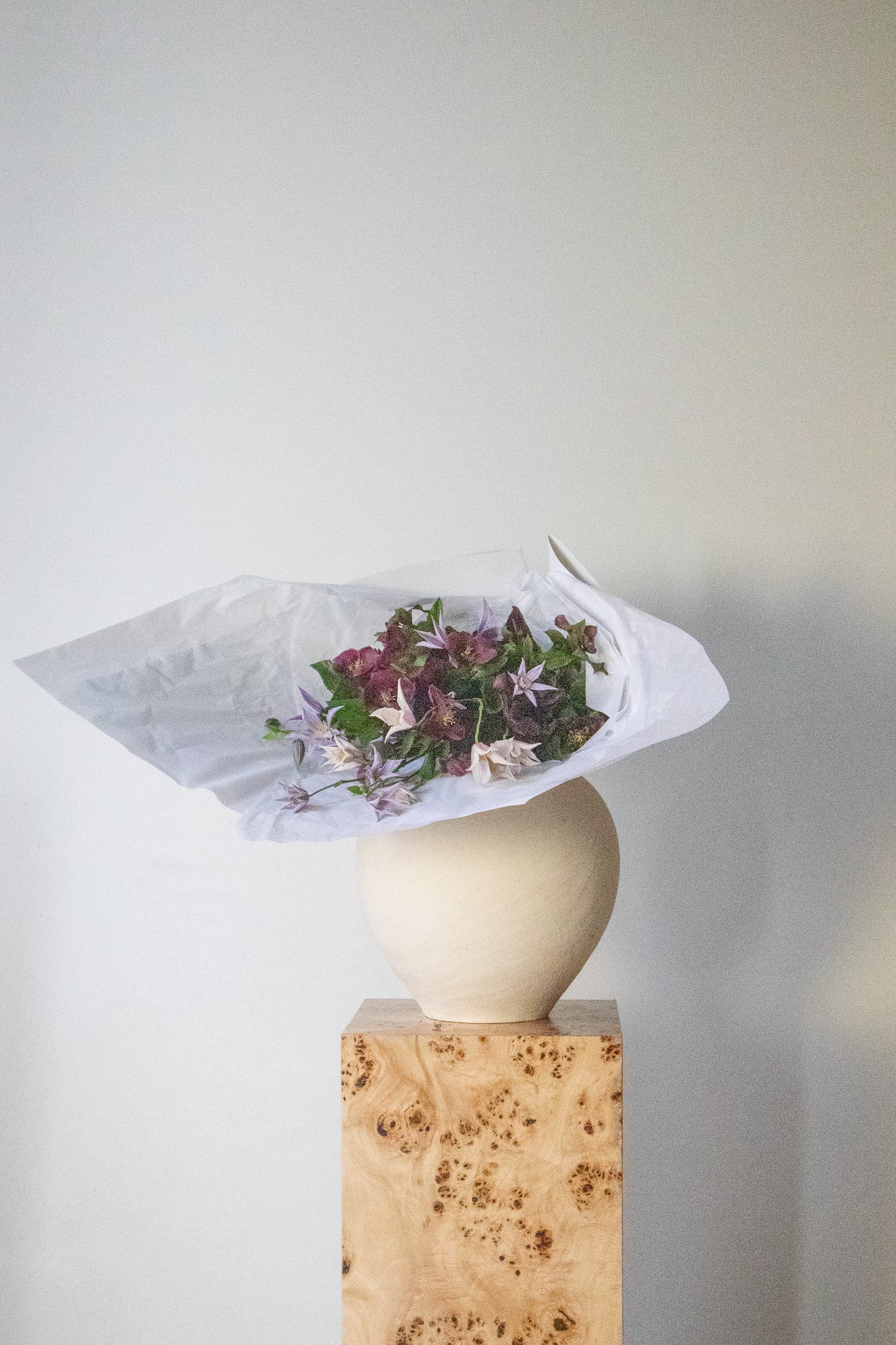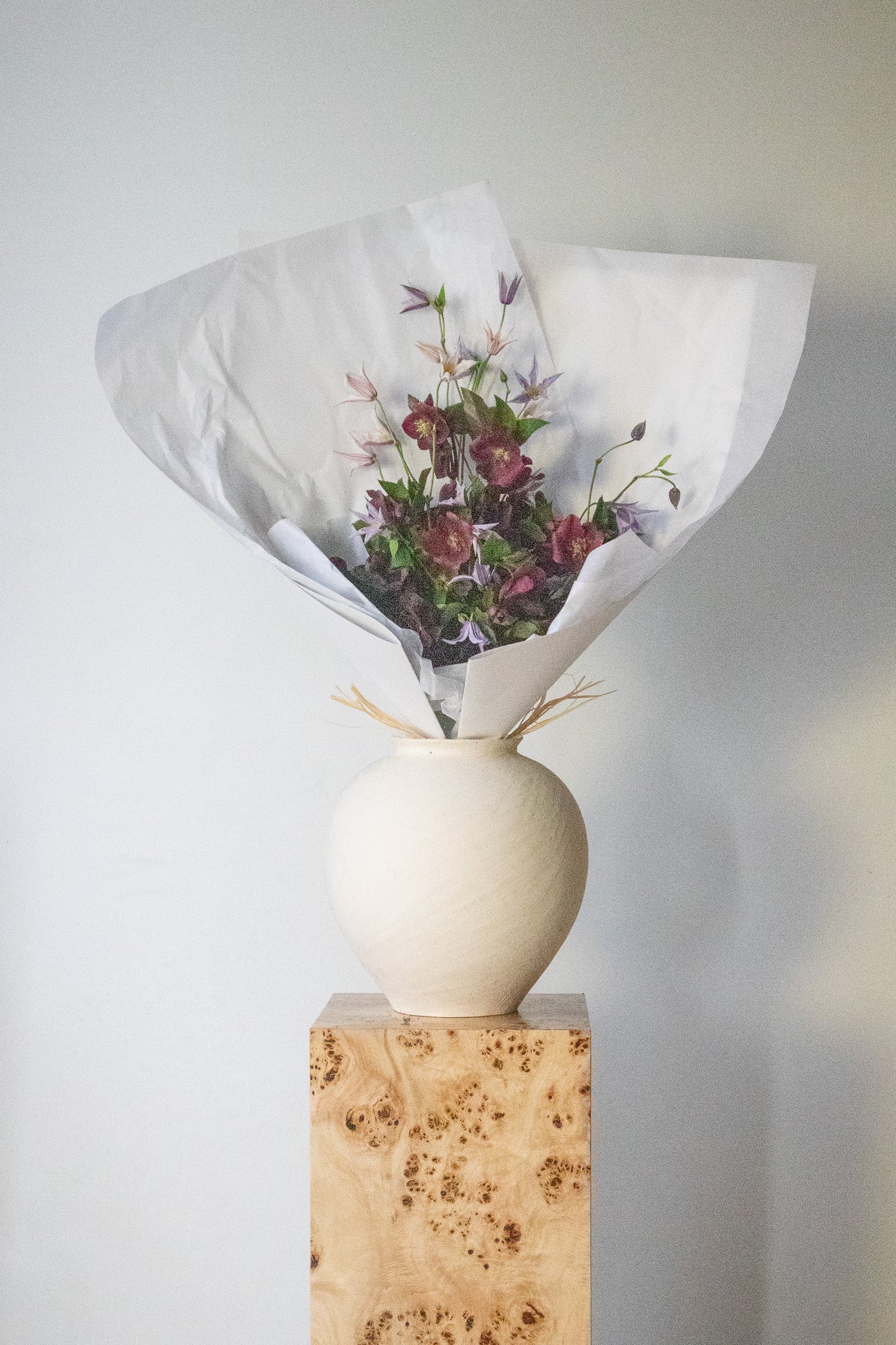 Our clematis and hellebore arrangement comes gift wrapped in water and finished with our care guide and handwritten note card.