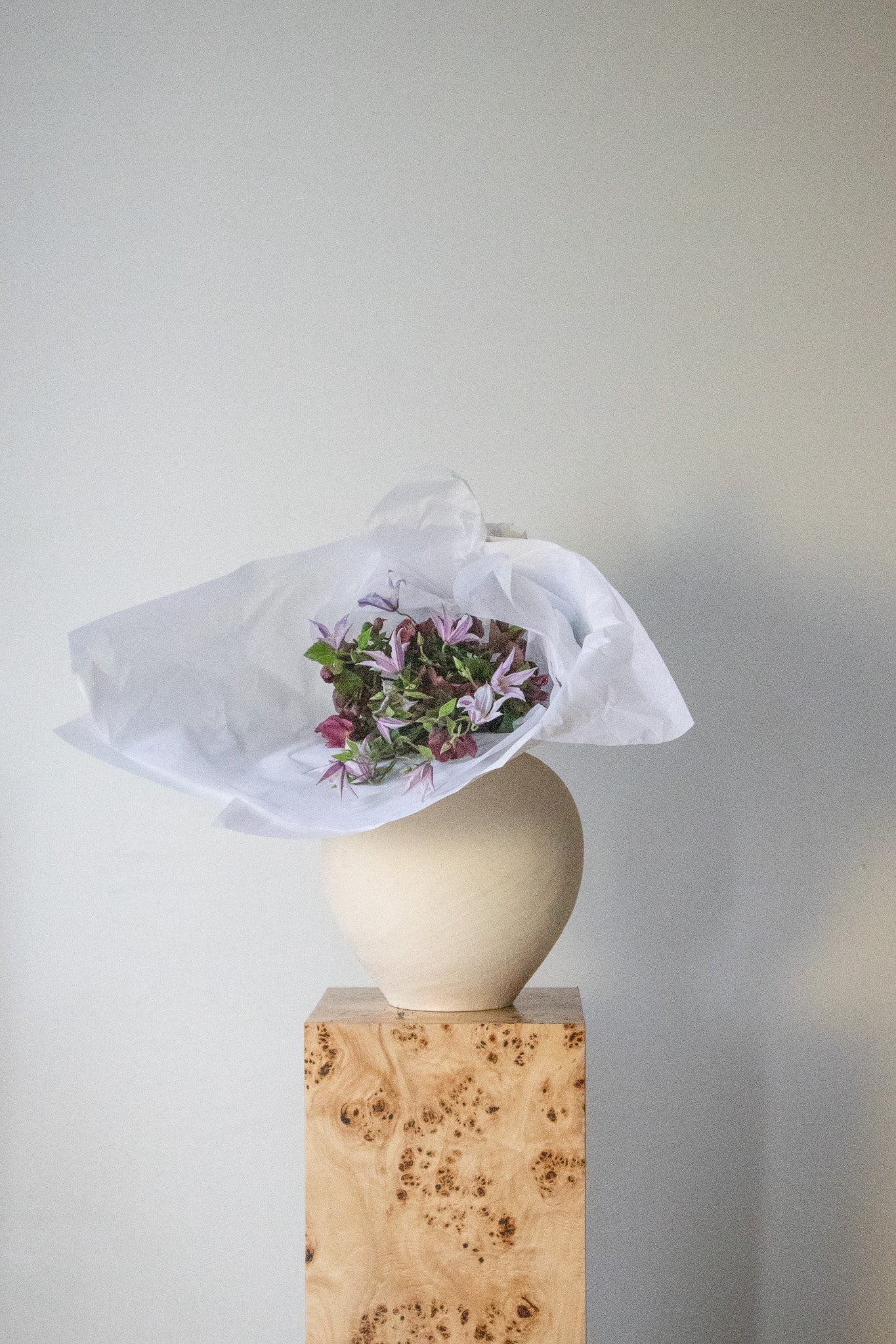 Our clematis and hellebore arrangement comes gift wrapped in water and finished with our care guide and handwritten note card.