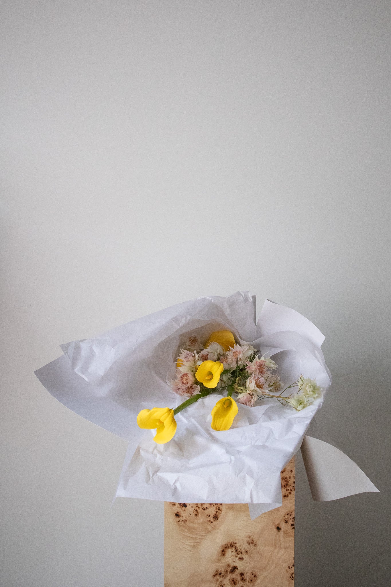 Our Blushing Bride and Yellow Calla Lily arrangement comes gift wrapped in water and finished with our care guide and handwritten note card.