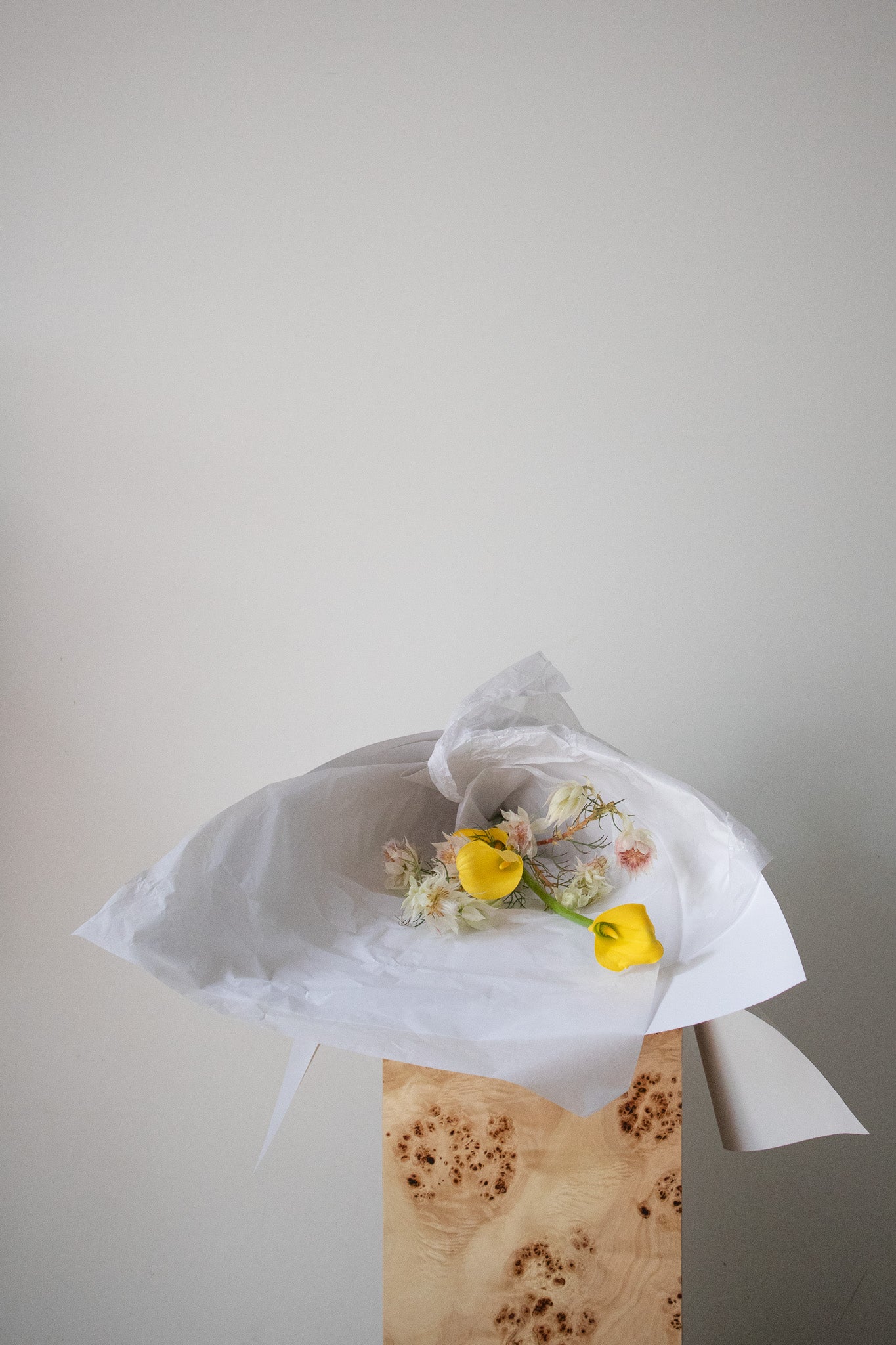 Our Blushing Bride and Yellow Calla Lily arrangement comes gift wrapped in water and finished with our care guide and handwritten note card.