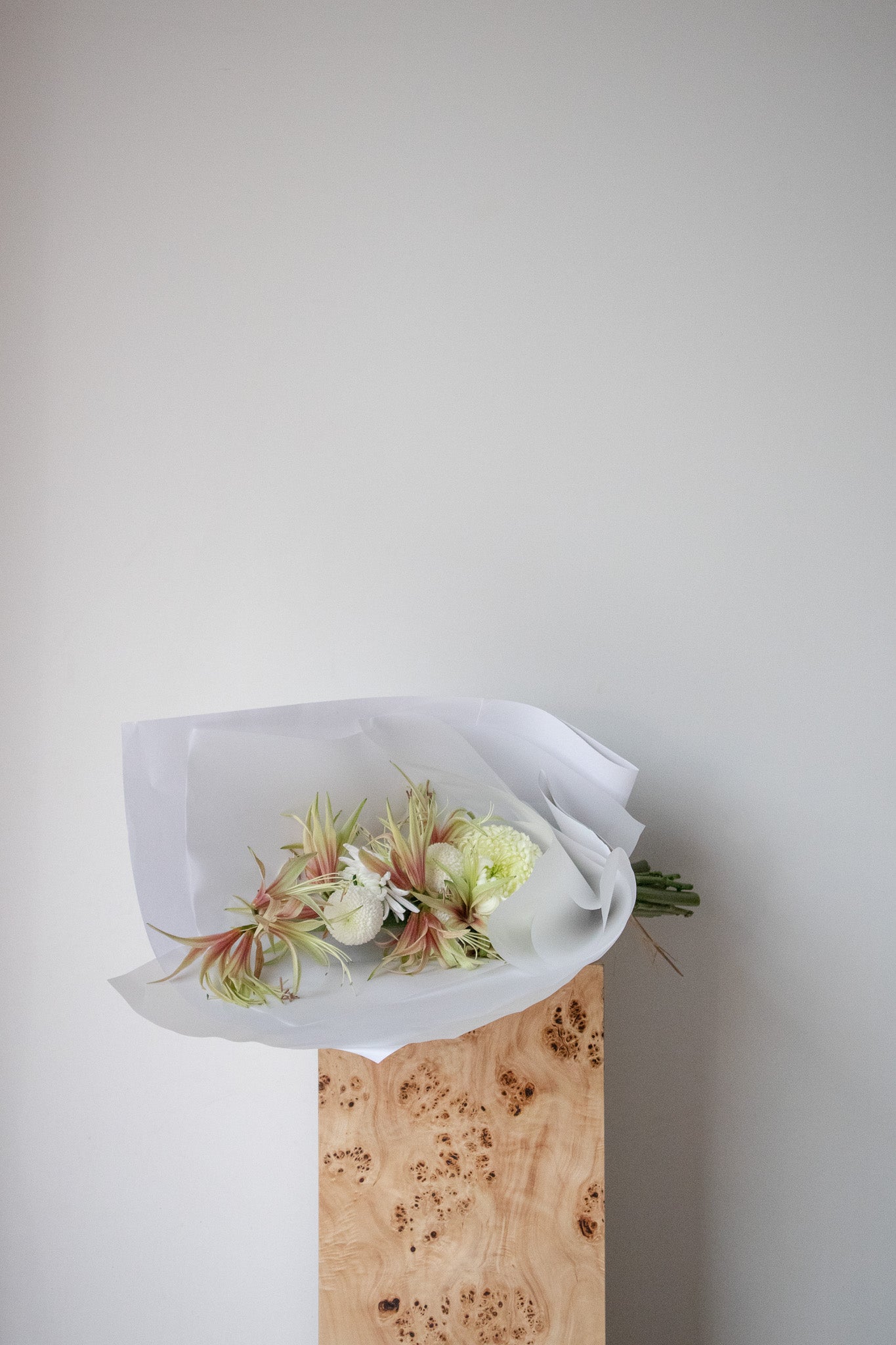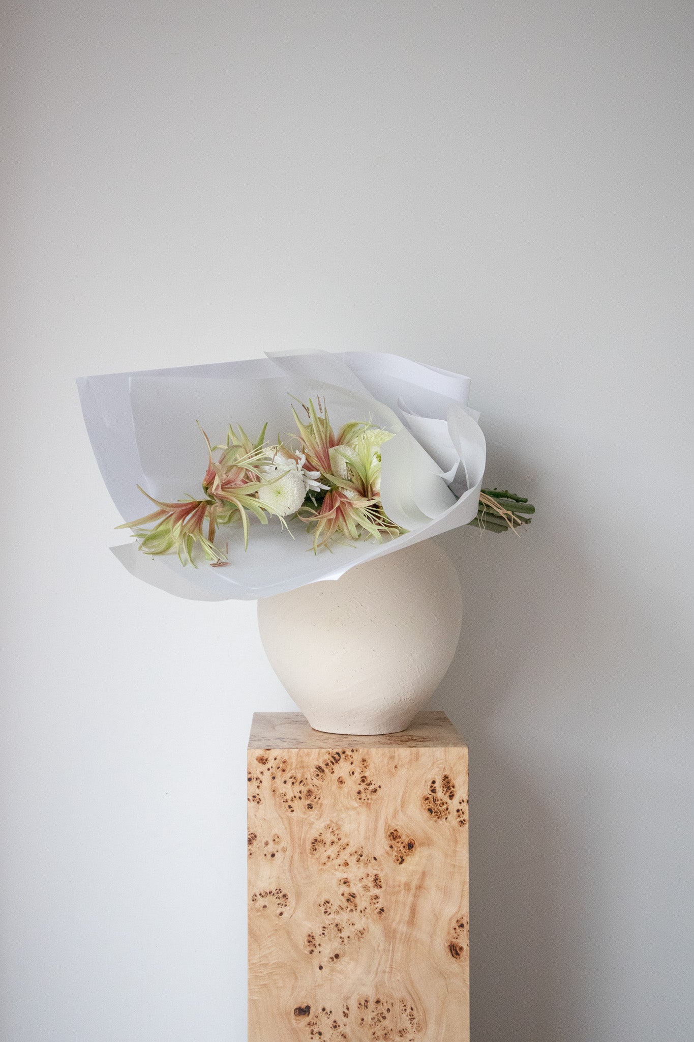 Part of our complement series, a paired back and elevated arrangement, featuring two varieties of interesting and complementary flowers.