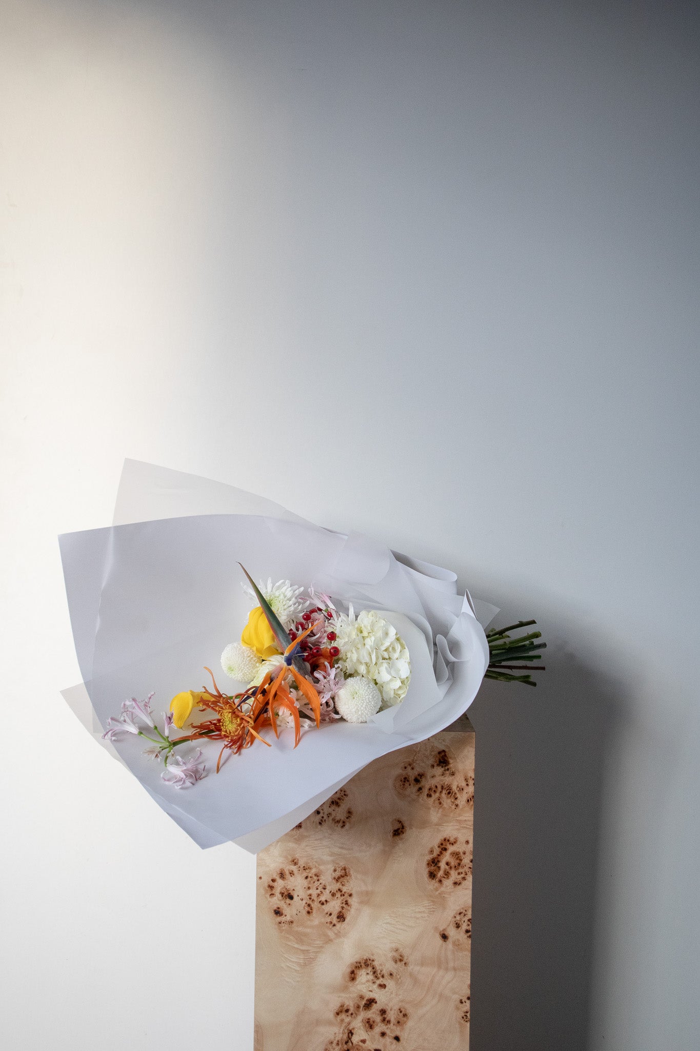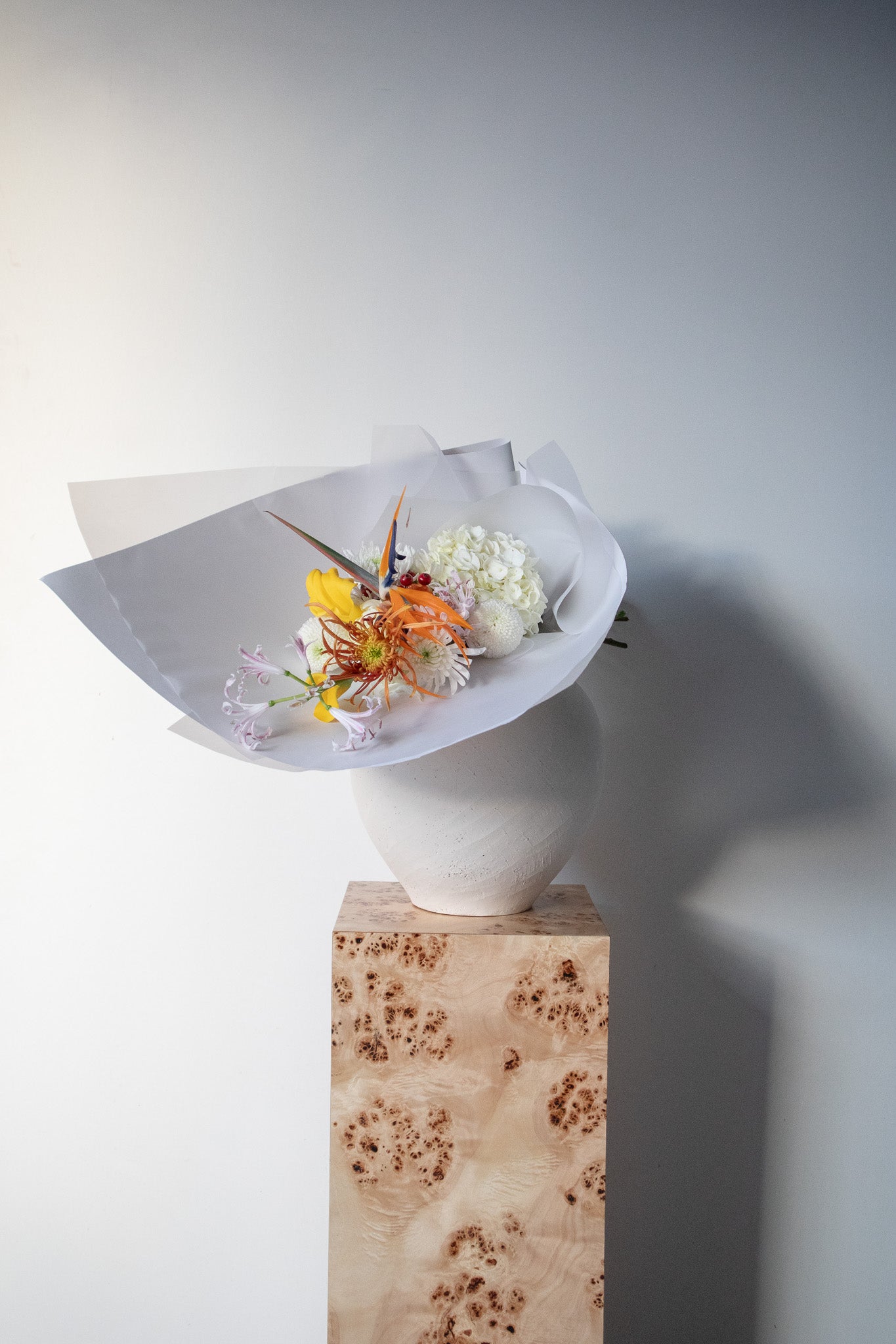 Seasonally inspired arrangements, featuring unusual shapes and textures. Gift wrapped in water and finished with our care guide and handwritten note card.