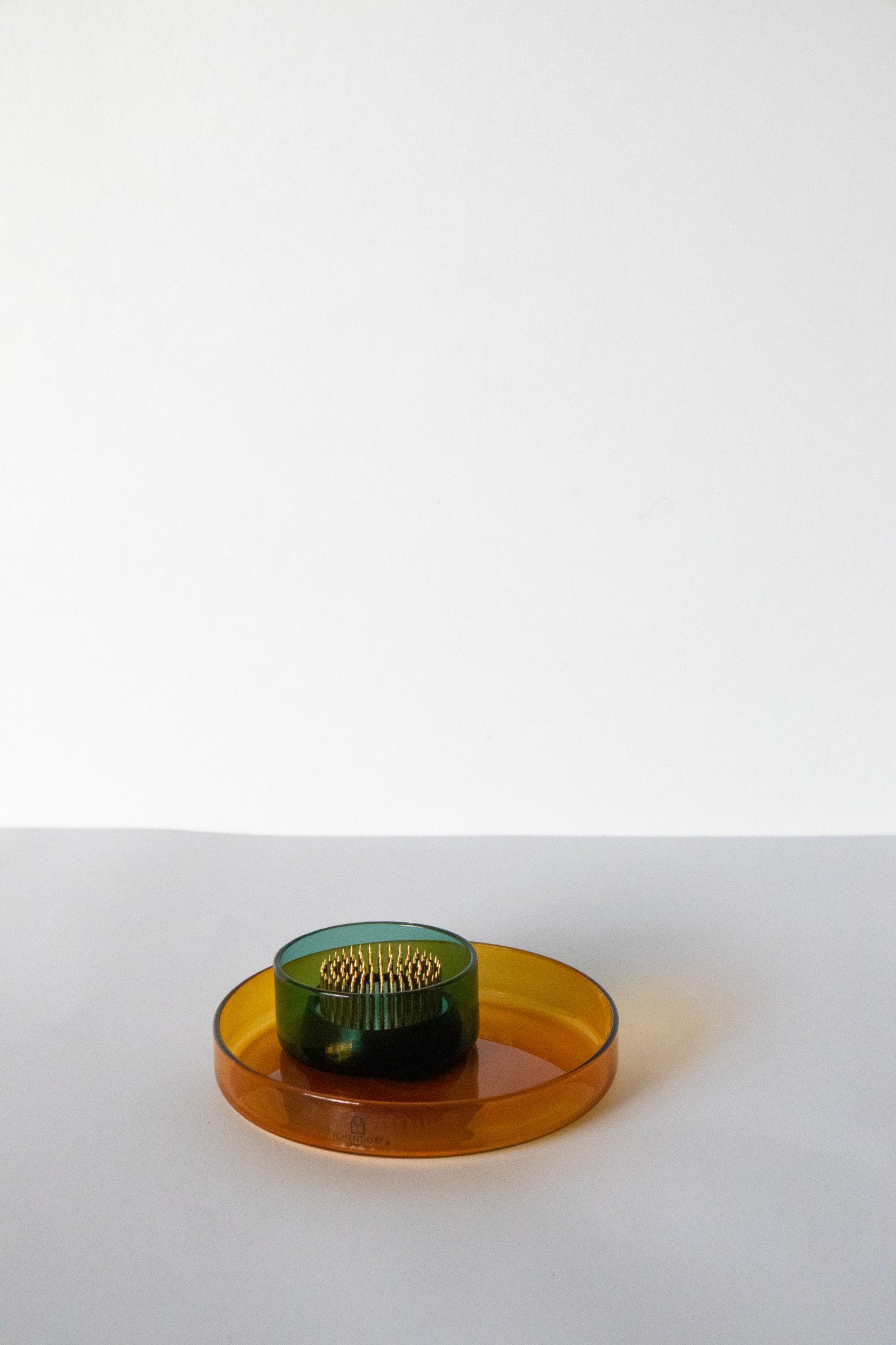 Petrol green tray 6.5cm + amber tray 13cm + brass flower frog 5cm